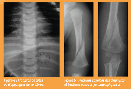 Ces fractures sont difficiles à identifier et nécessitent une technique rigoureuse et un oeil expert. Les fractures de côtes ou d’apophyses de vertèbres sont pratiquement synonymes d’enfant battu en dehors d’un polytraumatisme connu.