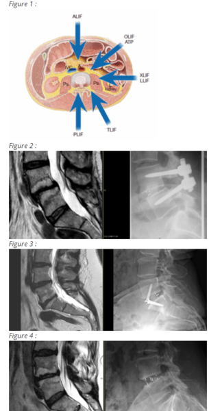 Différentes voies d’abord  et techniques ont été élaborées au fil des ans (figure 1). Les techniques qui restent le plus fréquemment utilisées à ce jour, sont les techniques dites postérieures. Elles associent le vissage pédiculaire à la mise en place de greffons intersomatiques par un abord postérieur (PLIF : laminectomie préservant les articulaires postérieures) ou par un abord postéro-latéral (TLIF : laminectomie avec arthrectomie) (figure 2). Ces voies d’abord autorisent une restauration partielle de la lordose (taille des cages limitée par la voie d’abord) mais surtout, permettent d’y associer un geste de décompression nerveuse. Lorsqu’elles sont réalisées de façon classique, elles occasionnent néanmoins, un affaiblissement des muscles paravertébraux. L’association fréquente des lombalgies dégénératives à des douleurs neuropathiques nécessitant une recalibration canalaire justifie toutefois le recours fréquent à ces techniques.